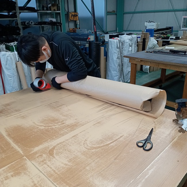 ▽ 梱包のために巻きます。厚いと抵抗があるため、身体を使いながら抑え込んでいきます。