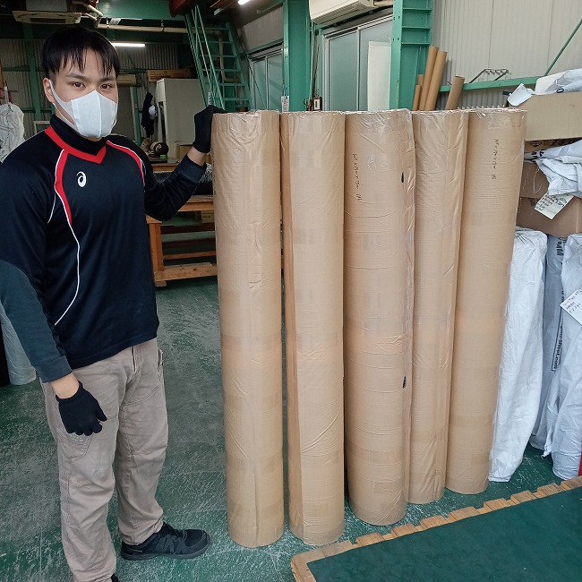 ▽ カットした後に梱包のために巻きます。分厚くて幅広なので体重をかけながらでないと巻けません。