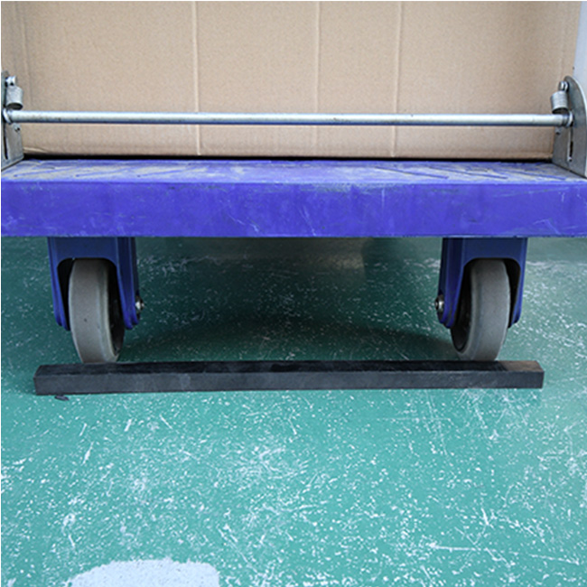 台車用ゴムストッパーは”角棒状に切った厚物ゴム”で、その名の通りの台車用のストッパーです。簡単に持ち運びできて手軽に設置できるところがポイントです。