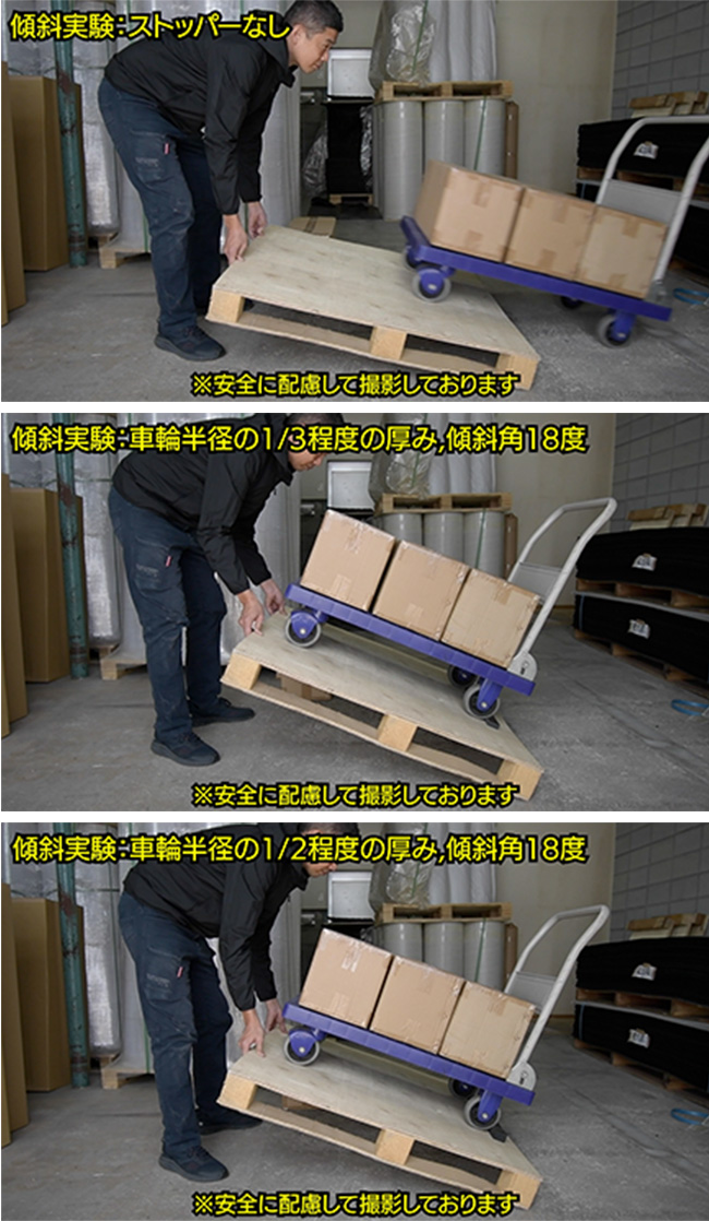 スロープと比べると、小さな段差を置くメリットは、段を越える途中(段差解消に乗り上げた時点)では力を入れ続けなくても台車が戻らないことです。スロープの場合、上り切るまで力をかけ続けなければいけません。