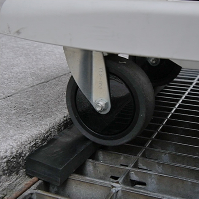 普段はストッパーとして使用するゴムが、状況に合わせて持ち運び可能な段差解消になる。というのが、この台車用ゴムストッパーのもう一つの利点なのです。