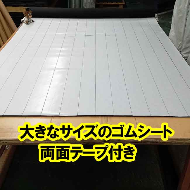昨日に続いて両面テープ付きのご案内です。両面テープは大きな面積のゴムに貼り付けて納品することもできます。テープを使う量、テープを貼る時間は面積が大きくなるほど多くを費やしますので単価が大きくアップしますが、使用現場の仮止めで大活躍してくれると思います。