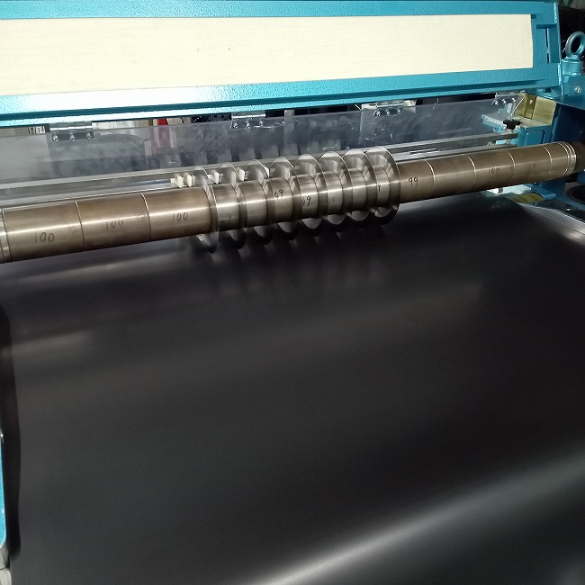 ▼ 写真のような鋭利な丸刃を回転させて、ゴムを切断していきます。丸刃は複数セットできます。