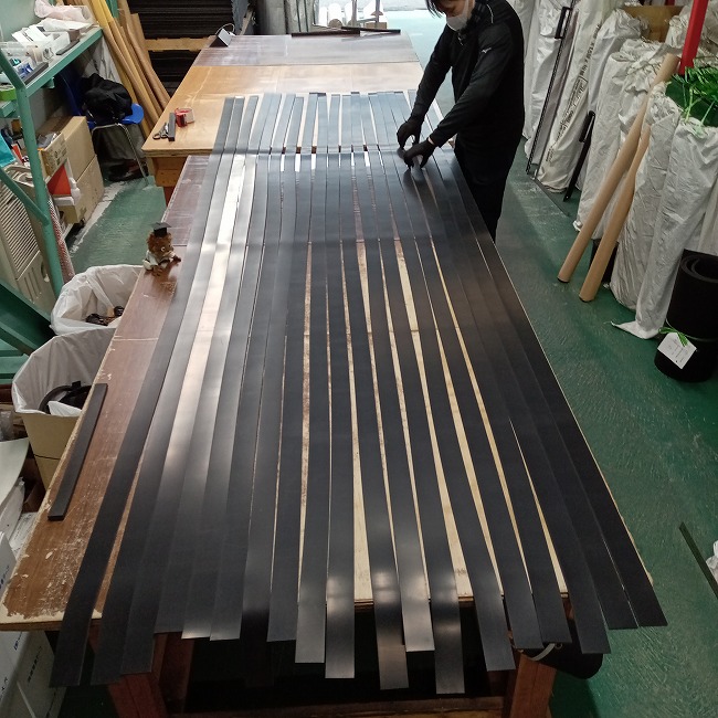 ゴムシートのオーダーカットは様々な形状でカット可能ですが、特に多いのが細長く切るご依頼です。長尺ものを細長く切るのは現場では非常に困難で時間がかかるため、カット工賃がかかってもご依頼いただくことが多いのです。