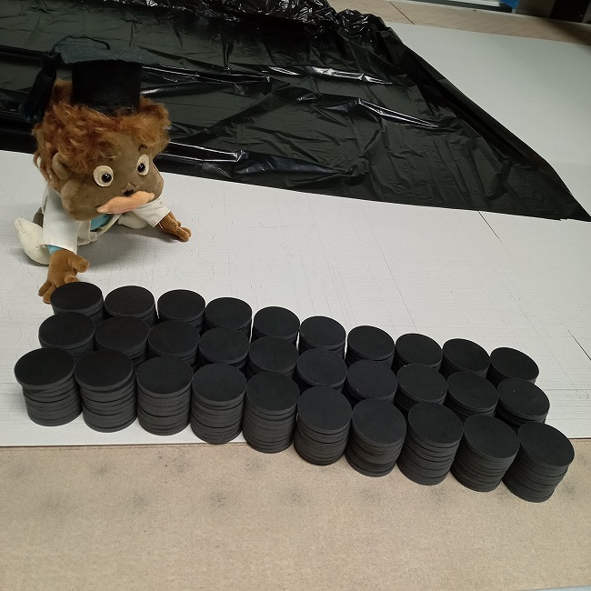 ゴムを円形にカットした事例です。テープなしで小さめのサイズであれば、当日出荷できることもあります。お急ぎの場合はお伝えくださいませ。滑り止め、緩衝材、機材の養生などにお使いいただくことが多いです。もっと複雑なパッキン形状でもお急ぎの場合はご相談くださいませ。