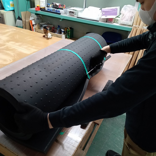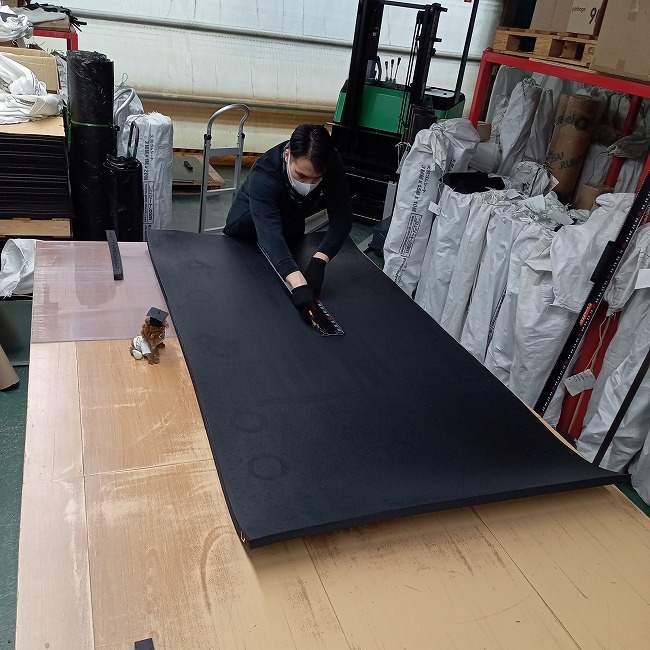 歩行路、車両通行路(仮設、ぬかるみ防止)、製品置き場の直置き防止など養生全般に便利なゴムマットです。長尺品はありませんが、面積比では天然ゴムよりも安いため現場で好んで使っていただいてます。