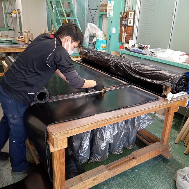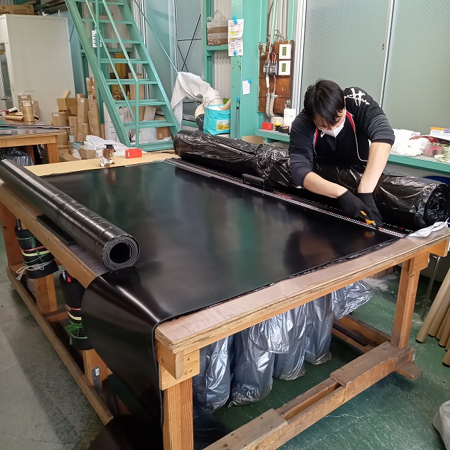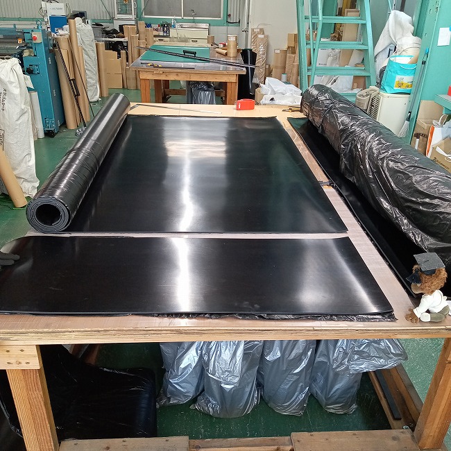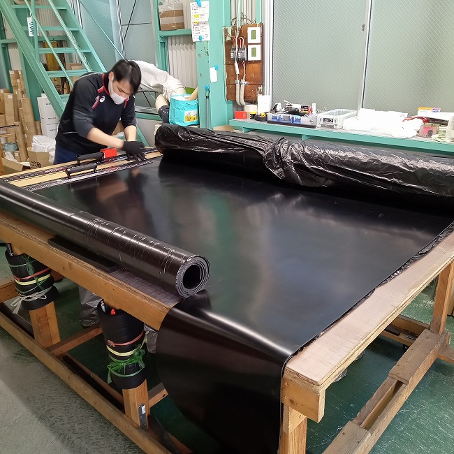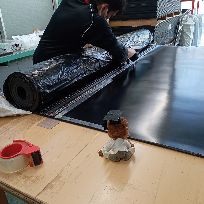 ゴムシート.comは広げる場所があり、大きなゴムの扱いも慣れており、大きな定規もあります。ゴムを切ることに特化した私たちにお任せください。