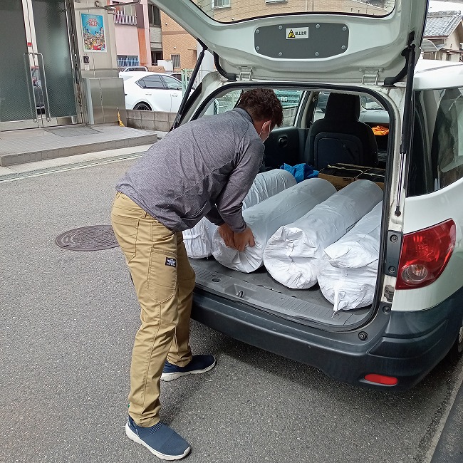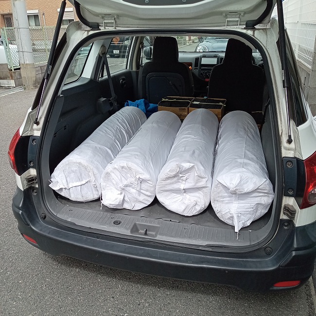 まず、ご希望通りにならないことが多いです。ごめんなさい。配達は物流センターのスタッフが行うのですが、メインはゴムシートのカットおよび出荷作業ですので、当日の段取りを変えて配達業務に専念することが難しいのです。また、動ける場合も距離の制約があり遠方にはなかなか行くことができません。また現在保有する車両は乗用車バンですので積める量も限られています。