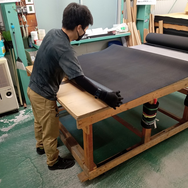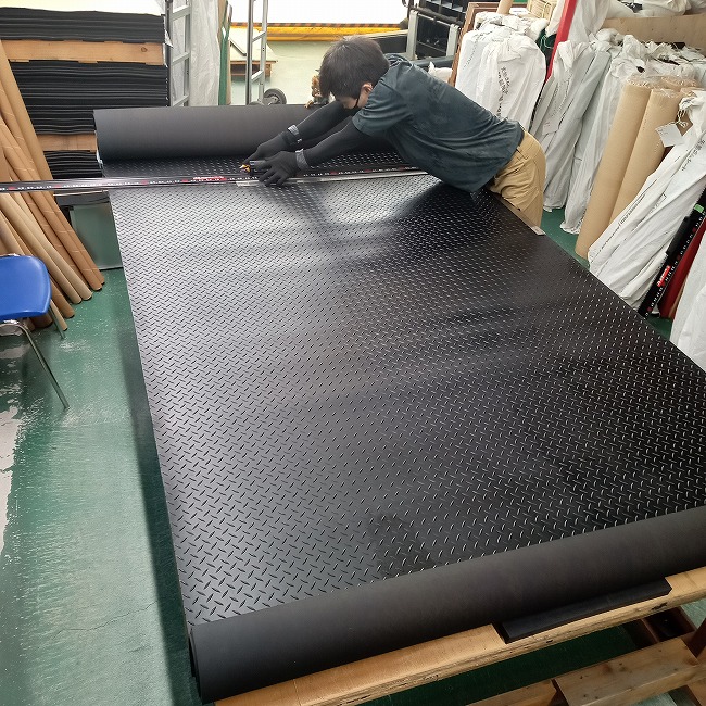 デイズデザイン様では展示用バイクとメンテナンスエリアに敷いていただいてますが、どちらも敷くだけの状態で問題なく使えています。ゴムマットは重量があり、ゴムの特性でズレにくいのでそのままでも問題なく使えるのだと思います。また接着しない方が手軽に動かせますし、巻いて保管することもできますので、ガレージ内を自由にレイアウト変更することができるのも強みです。
