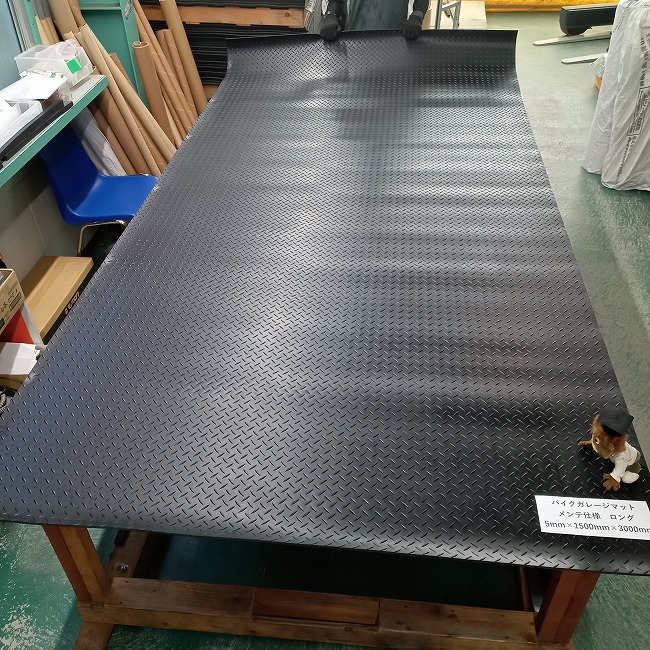 バイクガレージマットが人気です。幅1Mと幅1.5Mがあります。バイクを載せるだけなら1Mで充分なのですが、膝をついてカンタンなメンテナンスをされる場合には幅1.5Mがとても使いやすいです。1.5M×2.5Mと1.5M×3Mの2サイズをご用意しております。