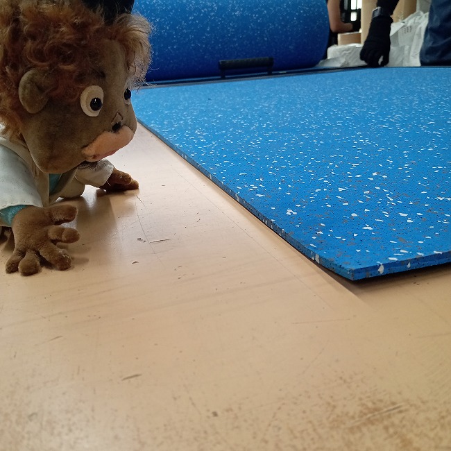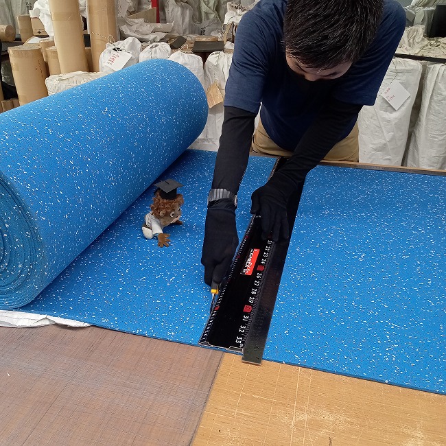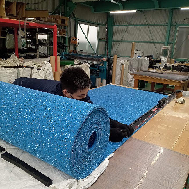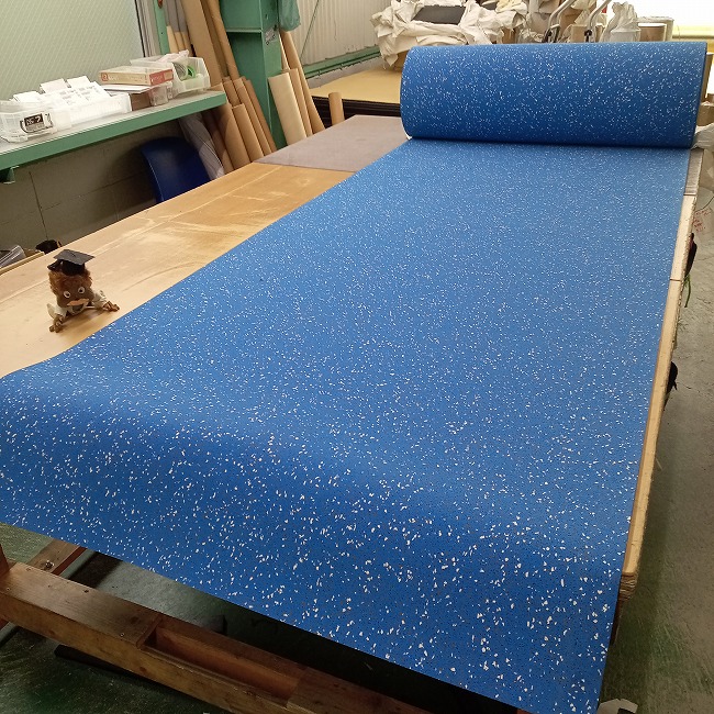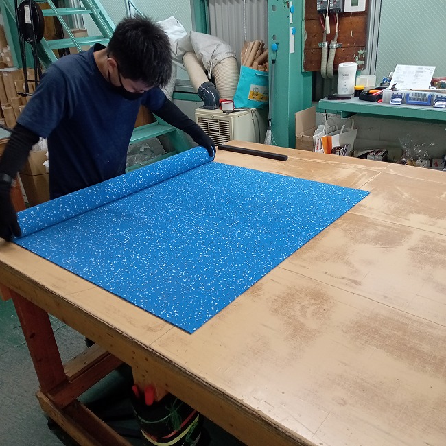 多くは陸上競技の練習マットとしてご活用いただいておりますが、スポーツジムの床材としても使っていただくことがあります。一般的な黒色ゴムよりも雰囲気が明るく、スポーツジムマットよりも継ぎ目が少ない、のが選んでいただく理由です。長尺品は継ぎ目が少なく敷けるのが利点ですが、巻き癖があるのが欠点です。商品到着後、逆巻きにして1~2日置いていただくなど、巻き癖を解消させる余裕を見ておいてください。