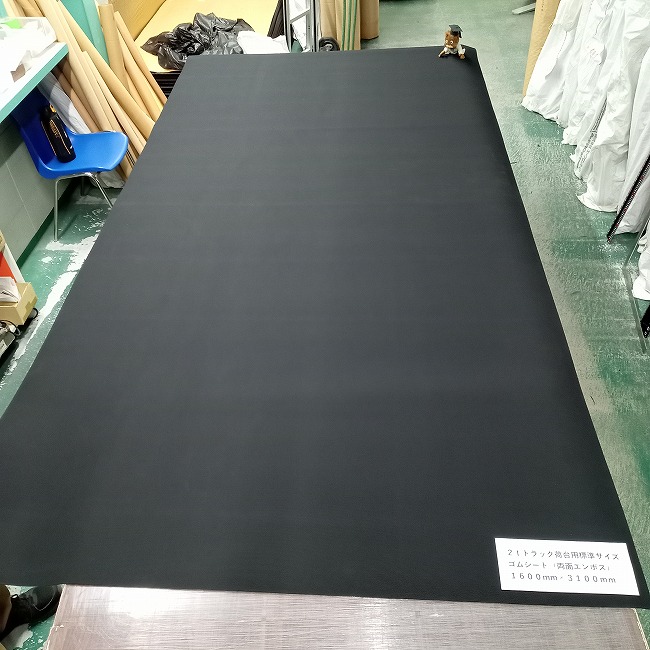 普通トラックの荷台幅に合わせて開発したトラック荷台マットが好評です。1.6M幅のゴムは珍しく、トラックの納品に合わせてディーラー様や中古車店様にご注文をいただくことも多いです。もちろん運送会社様や個人事業でトラックを扱っておられる方からのご注文も多い商品です。