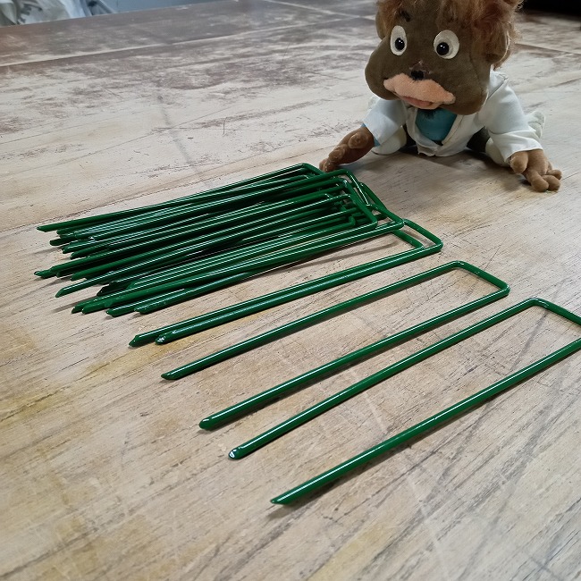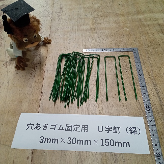 舗装していない場所に穴あきゴムを使われる際、ズレが心配な場合はU字釘を使うとカンタンに固定できます。長い、短い、釘と釘の間の寸法はどのくらい?など考えることが多いので、ゴムシート.comでU字釘をご用意しました。