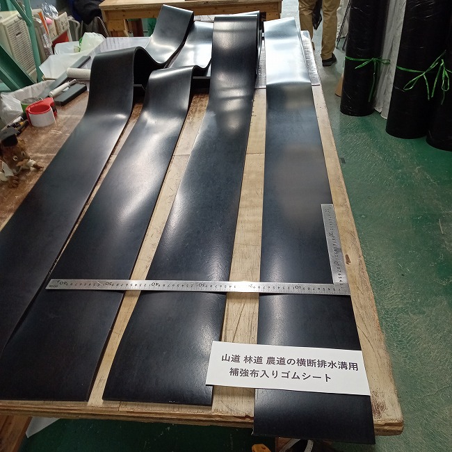 林道や山道の維持管理目的で横断排水溝工事または路面排水工事と呼ばれる工事があります。その工事で路面に埋め込むユニットに使われているゴムは裂けにくいことが要求されます。ゴムシート.comの補強布入りゴムが採用されるケースが増えています。