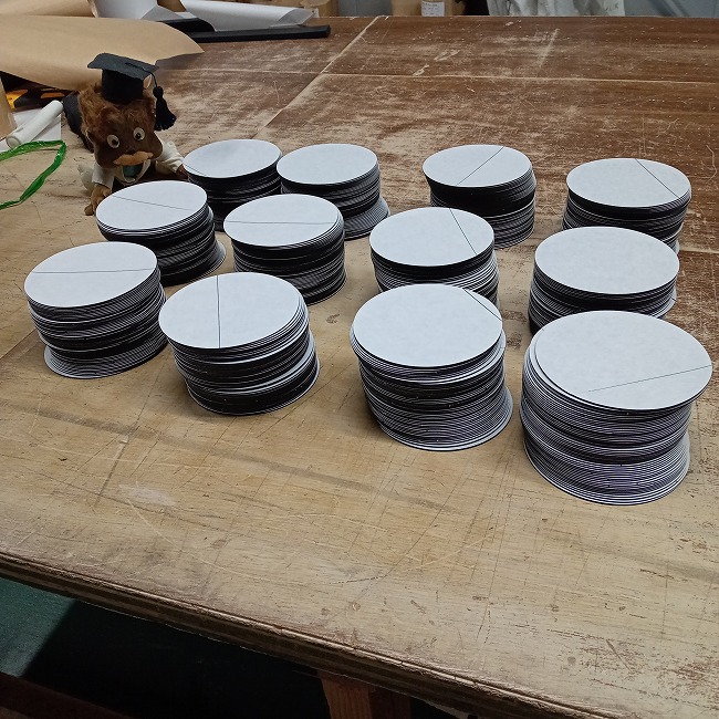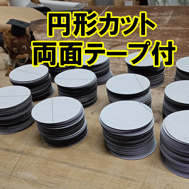 ゴムの円形カット+両面テープ付きも可能です。直径10mm程度のサイズから1M弱の大きさまで様々なサイズに対応可能です。円形はお客様の現場ではきれいに切ることが難しいので、オーダーカットのご依頼が便利です。