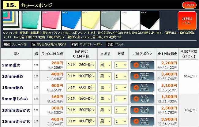 黒/白/灰/青/赤/黄/緑ですが、人気は白、青、赤、緑などです。ゴムの場合はカラーゴムは黒に比べて高額になりますが、スポンジの場合は黒もそれ以外の色も同額ですので、映える色が人気です。