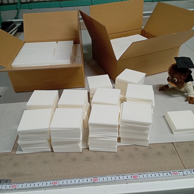 ゴムがメインですが、スポンジのカットも可能です。ゴムに比べて少量ですがスポンジの在庫もございます。実はスポンジをきれいに切るのは難しいのです。私たちは機械で切れますが、カッターナイフで切られる際は慎重に作業してください。