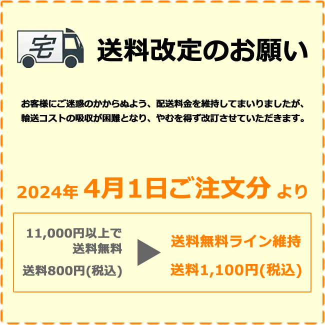 お客様にご迷惑のかからぬよう、これまで配送料金を維持してまいりましたが、輸送コストの吸収が困難となり、やむを得ず今回の改訂となりますことをお詫び申し上げます。