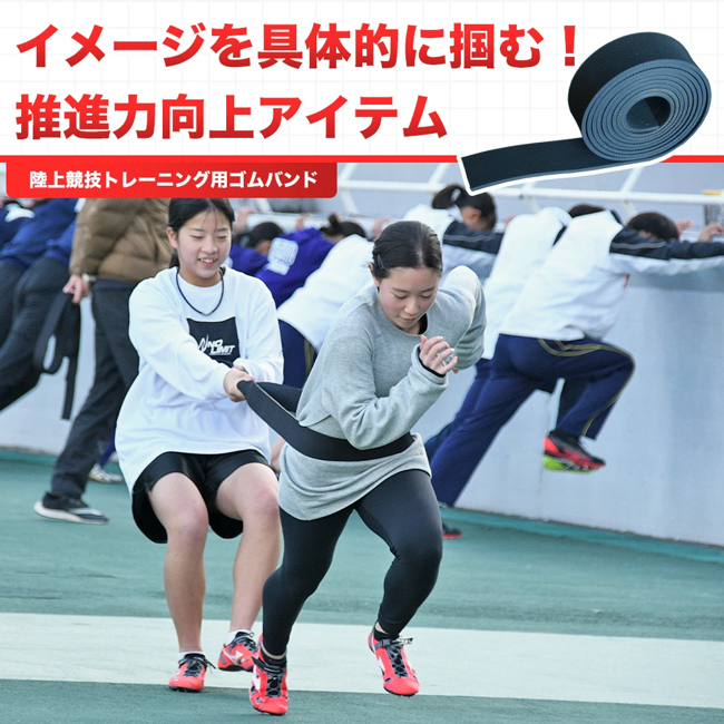 強く引っ張ることが主な目的ではなく、加速に必要な前傾姿勢を身体に覚えこませるためのアイテムです。決して引っ張り合いをするわけではなく、練習する選手(前でゴムを腰に巻く役割の人)が前傾姿勢するのを後ろの人が助ける練習です。ゴムバンドなしだと前に倒れてしまうので、このアイテムが必要なのです。