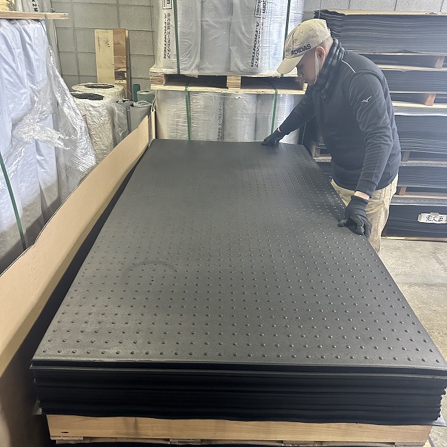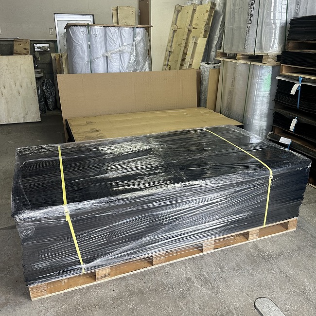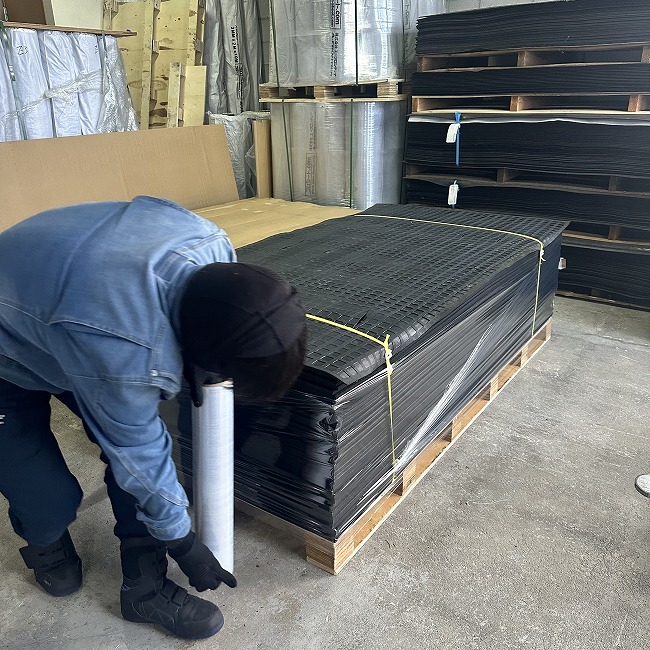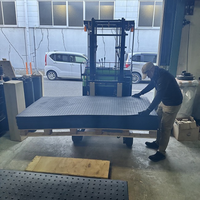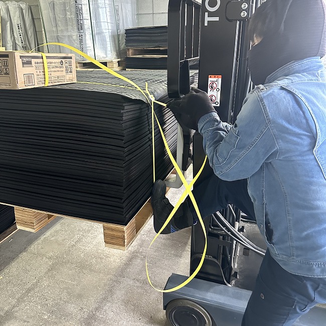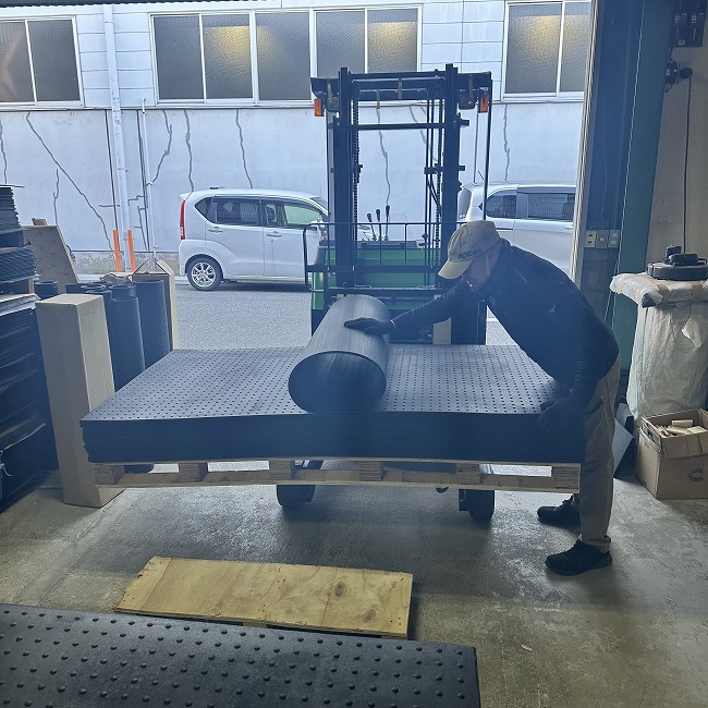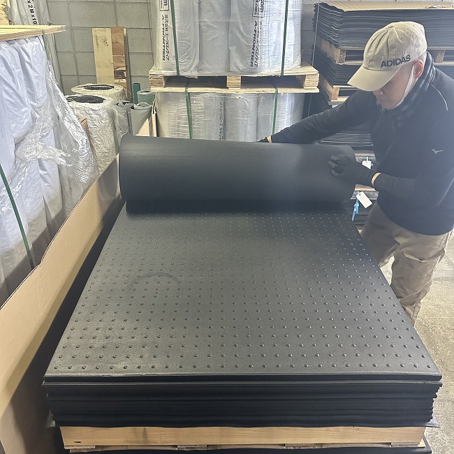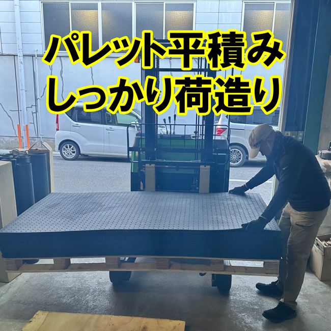 特にリサイクルゴムに多いですが、大量のご注文時には巻かずにパレットに平積みで出荷納品いたします。枚数やサイズに応じて荷崩れがないようにパレットサイズや梱包方法を工夫しています。