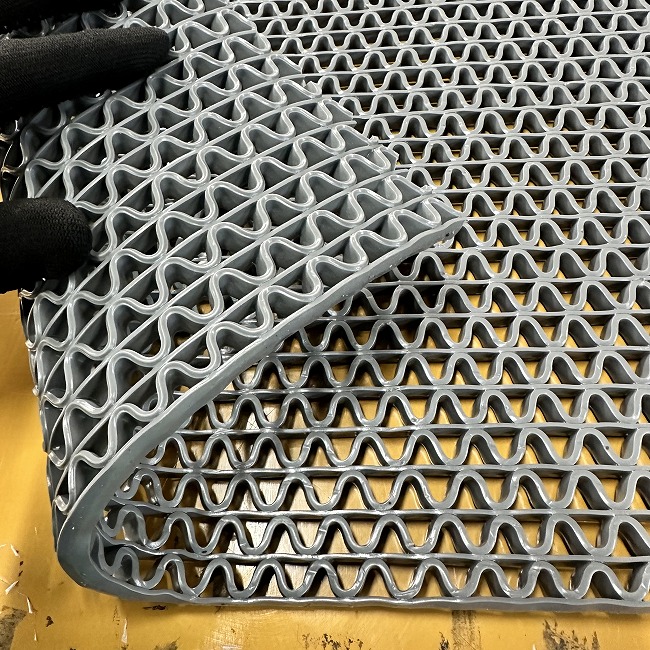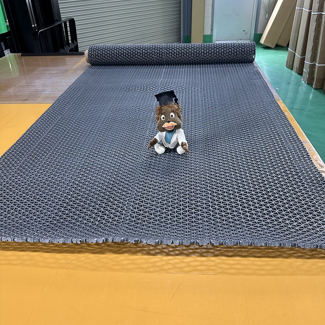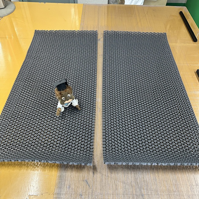その名の通り、PVC(塩ビ)です。ゴムと比べて軽量でカラー製品が比較的安価です。グレーチングカバーに使うので色はグレーにしたかったのです。グレーチングは鉄製なのでシルバーですが、黒のゴムシートを敷くと真っ黒になってしまうのですよね。雰囲気が大きく変わってしまいます。敷くことで美観に影響のない(少ない)ものを考えた場合に色はグレーが良いと考えました。ゴムでグレー色は黒に比べて非常に高額になるためPVCでご提案をしています。