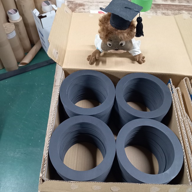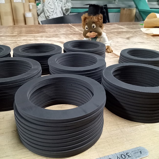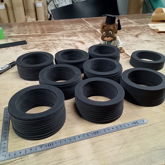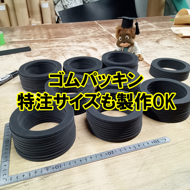 ご指定寸法のゴムパッキンを製作できます。在庫品で厚み10mm以下であれば即納できることもあります。特注サイズでも1枚から製作可能です。ご注文の都度、ゴムシートからカット製作していますため規格サイズでもすべてオーダー対応でございます。
