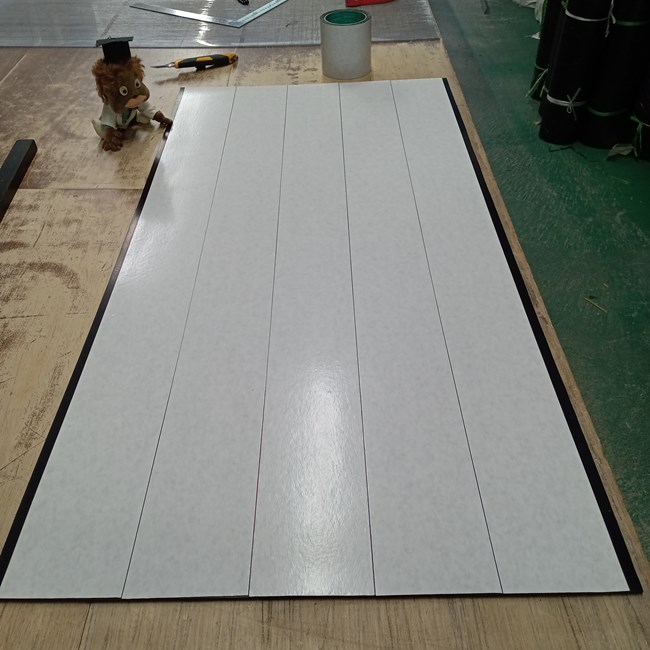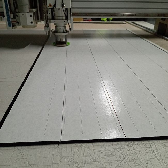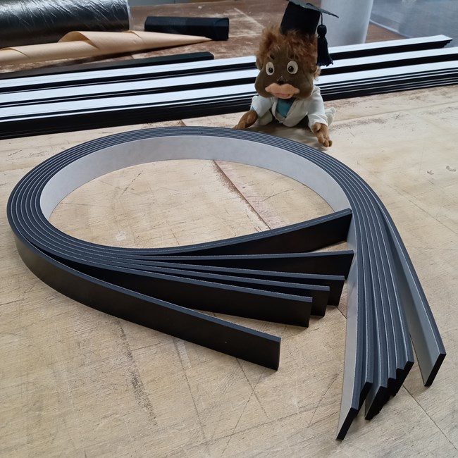 ▼ ゴムに両面テープを貼ってから製品寸法に機械で裁断します。