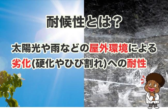 耐候性とは、日晒し雨晒しの屋外環境下での劣化への耐性です。ゴムは屋外環境で敷きっぱなしにしておくと劣化(硬化→ひび割れ)が早まるのですが、耐候性のあるものは、劣化しにくいのです。