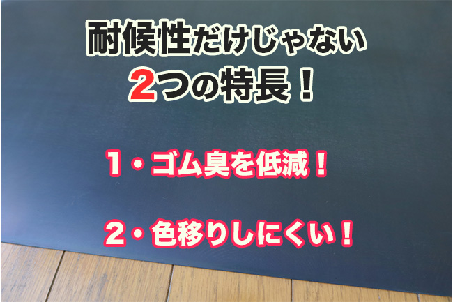 「耐候性に優れている」と言うと、いかにも屋外向けの商品のように聞こえますが、今回ラインナップしたゴムシートには耐候性以外にも大きな2つの特長があります。それは、