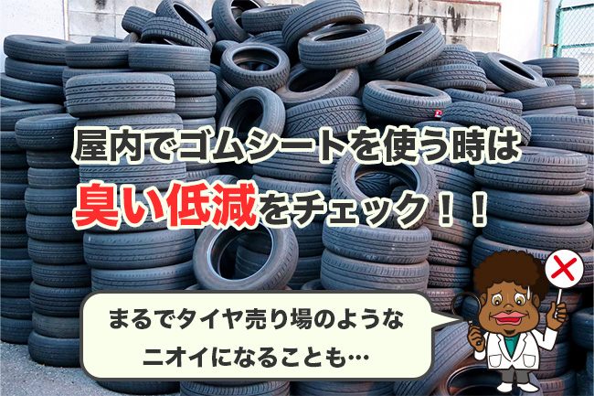 実は、ゴムのニオイは、特に屋内で使うゴムシートを選ぶ時に大きなウエイトを締めるポイントだったりします。「ゴムのニオイを低減してないゴムシートを屋内で使用したら、部屋の中がタイヤ売り場みたいなニオイになった!」ということにならないように、特に屋内で使用するゴムシートは「ニオイ低減があるか?」を検討材料に加えた方が良いのです。