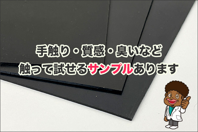 この「耐候性に優れたゴムシート」は、ゴムの嫌なニオイを極力抑えて製造されています。ただし、ニオイというのは個人差があるので、このゴムシートを使ったら絶対にニオイに悩まされることはない!という断言はできません。そこで、ニオイが気になる方が実際に商品を手に取ってニオイや質感をチェックできるように、ゴムシート.comにはサンプルをお取り寄せいただく仕組みがあります。ニオイに敏感な方は特に、一度サンプルでご確認をいただくことをオススメいたします。