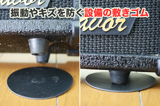 そして、2点目の「ゴムの色移り」ですが、こちらも絶対に大丈夫ということはありませんが、比較的色移りしにくい商品ですので、例えば、音響機材の下に敷いて、滑り止め、振動対策、キズ防止にお使いいただいたこともございます。家具や設備、機材などフロアに直接設置したくない場合に敷きゴムとしてお使いください。