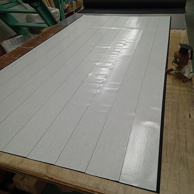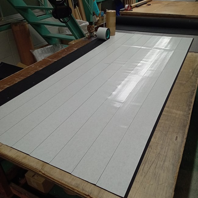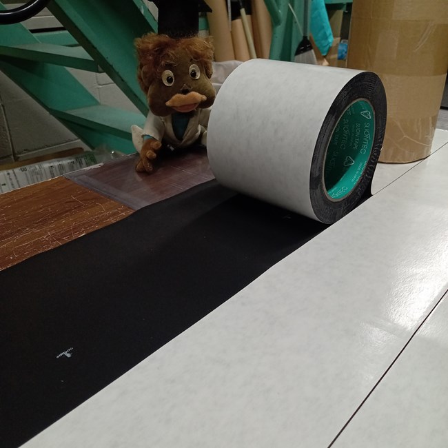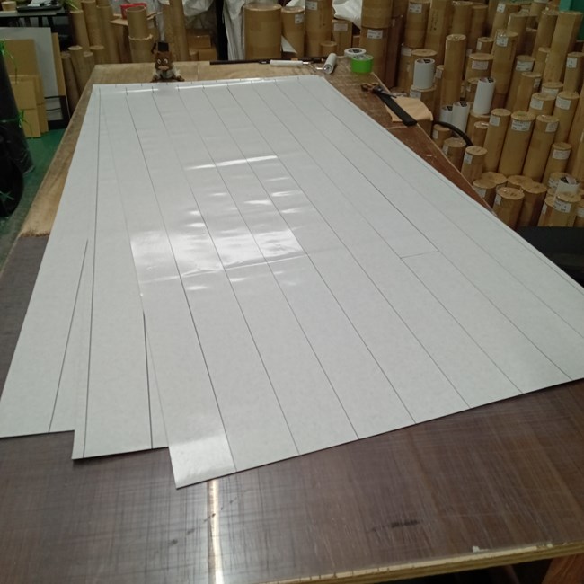 私たちが保有している強力な両面テープの製品サイズは100mm×20Mです。そのため、幅が大きなゴムシートに貼る場合はすべて継ぎ貼りになります。→100幅の両面テープを連続して出来るだけ隙間がないように貼ります。