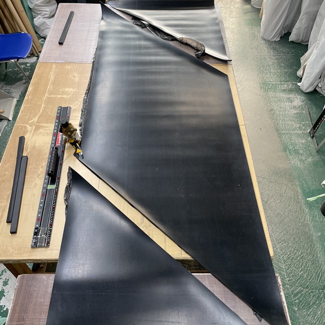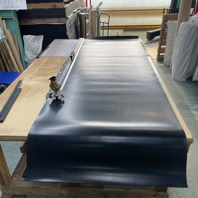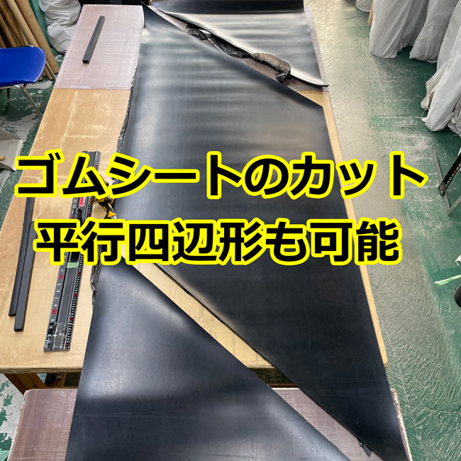 ゴムシートを様々な形状にカットしてお届けしていますが、今回は平行四辺形にカットした事例です。設置場所の形状が決まっている場合、このようにカットしてお届けするとすぐに設置できるので便利です。