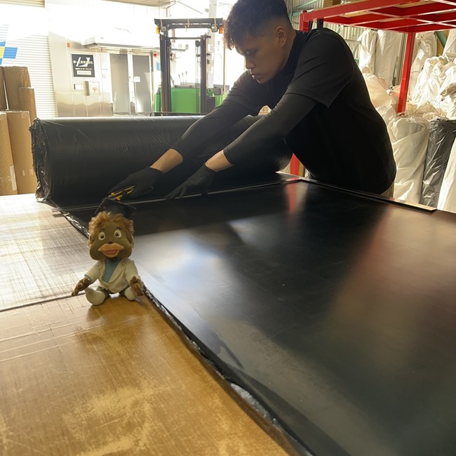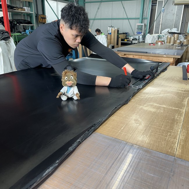 ゴムシートの切り売りが私たちの主な仕事です。各種材質から厚みと幅をお選びいただいて、必要な長さにカットしてお届けしています。切ってお届けするのはもちろんのこと、材質や厚みにお迷いの方のご相談にも親切丁寧に答えさせていただきます!