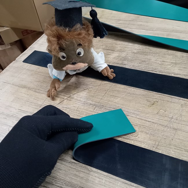 新商品の陸上ラインゴムです。グラウンドに石灰で白線を引くのではなく、長細いゴムをライン替わりに使う商品です。ゴムなので自在に扱え、長尺が使いにくい場合はハサミやカッターナイフで切ることも可能です。