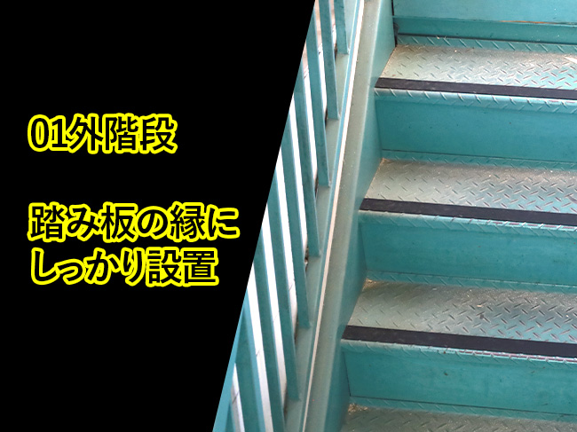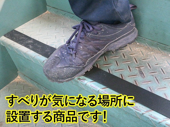 階段自体にも滑り止めのための縞板模様が入っていますが、さらなる安全確保のためゴム製すべり止めテープを貼ってスリップ対策をしています。
