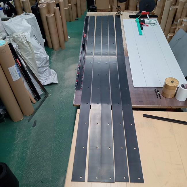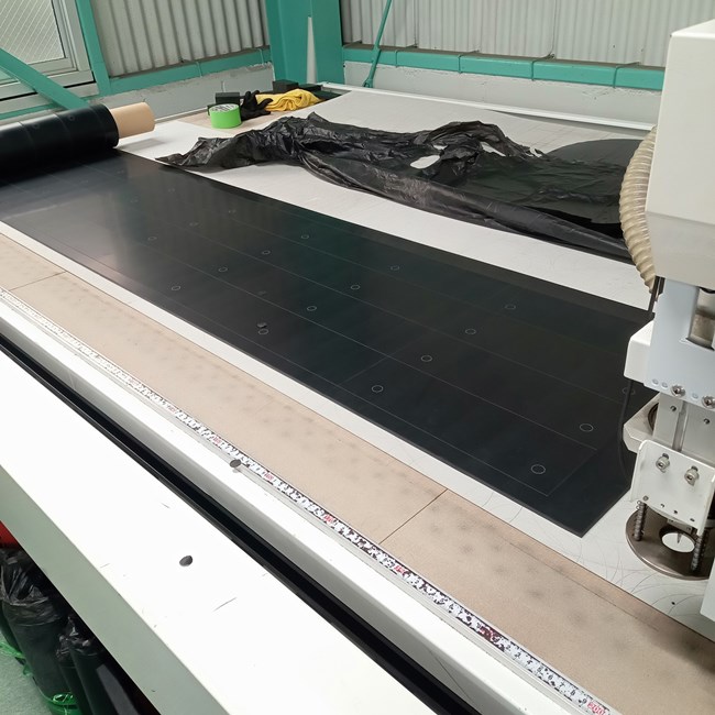 長尺のゴムシートにも穴をあけられます。ただし、長くなればなるほどゴムが伸縮する値も大きくなりますので、穴の位置もズレやすいです。ズレが許容できる設計であれば良いのですが、予想を超える伸縮があった場合には現場設置時に手間取ってしまうかもしれませんので注意が必要です。