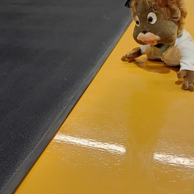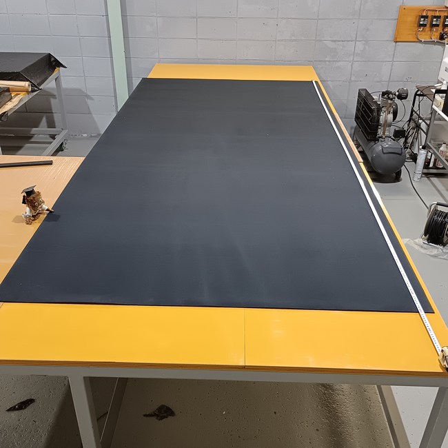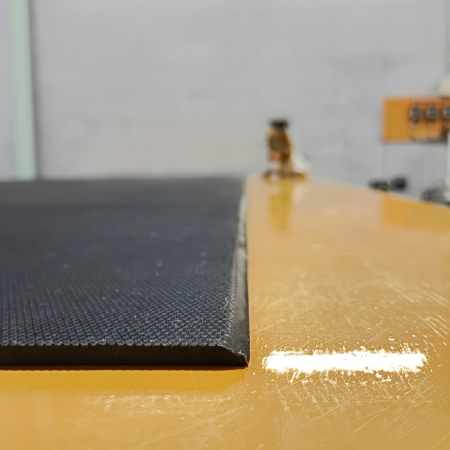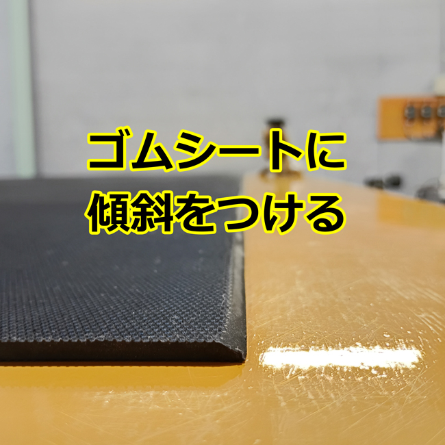 ゴムシートの縁に傾斜をつけることができます。大きなサイズも不可能ではないのですが手加工になりますので、できれば2M以内くらいでお願いしております。手加工はどうしてもアバウトになるので精密な寸法をご希望の場合はお断りさせていただく場合があります。