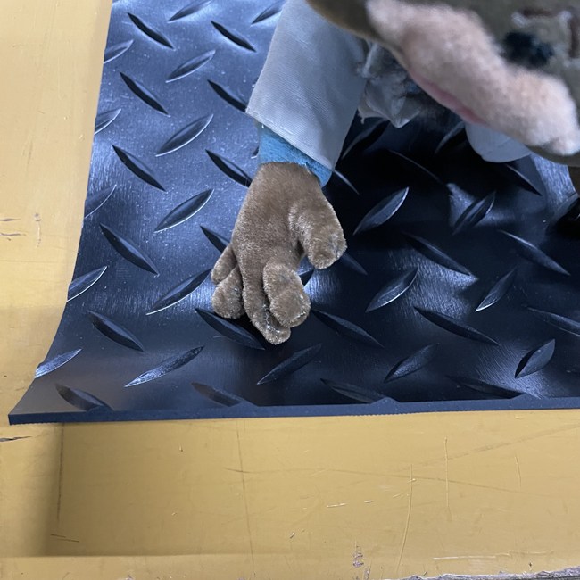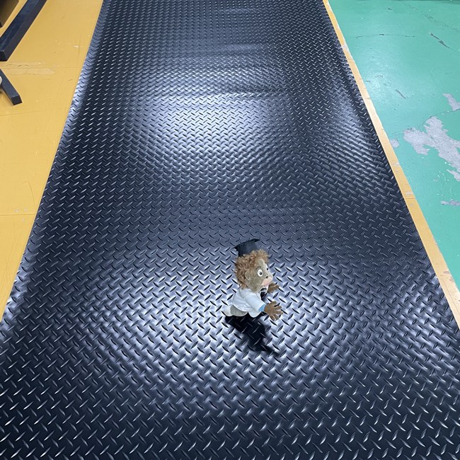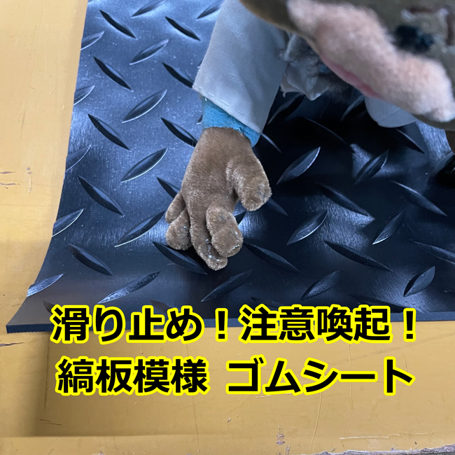 ゴムシート.comで1.2を争う人気商品、てっぱんゴムシートのご紹介です。鉄板によく用いられる縞板模様が片面に施されているゴムシートで、滑り止め効果はもちろんのこと、模様から連想される工事現場のイメージが注意喚起にも役立ちます。