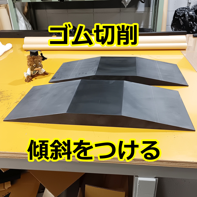 ゴムを切削して様々な形状にできます。今回は50mmのゴムの両側に傾斜をつけてみました。もちろん片側だけも可能です。このようにすることで段差解消や嵩上げをスムーズに乗り上げることができます。
