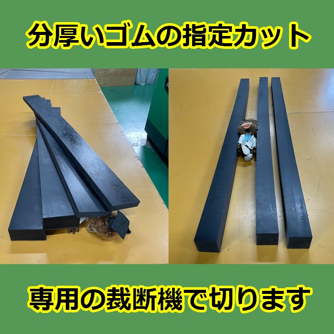 厚いゴムも短納期可能です。また専用の裁断機でカットいたしますので切断面は美しく、寸法も正確に出すことができます。特に角棒のように厚さと幅が同じ(近い)だと手作業では切るのが難しいのですが、専用の裁断機があれば難なく切断することができます。