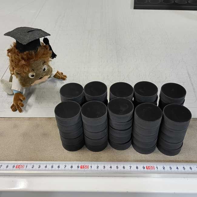 円形カットは嵩上げや緩衝材に使われることが多く、薄いものだとパッキン、厚いものだとカップリングなど様々な用途が考えられます。今回は厚い部類に入る15mm厚の円形カットの事例です。