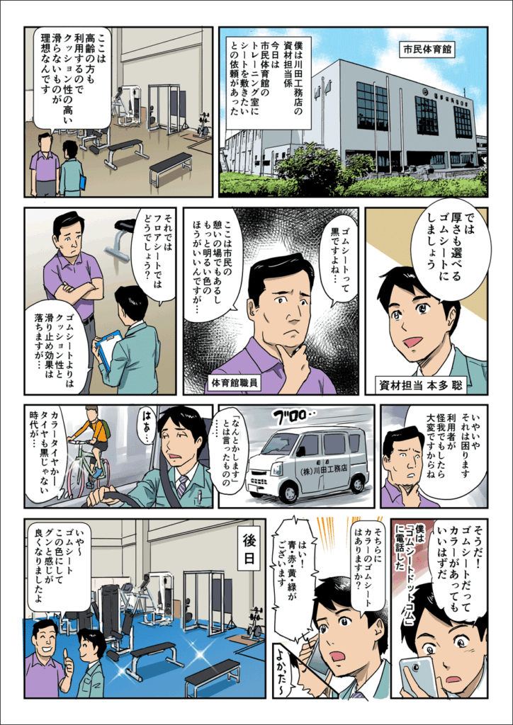 カラーゴムは4色(青・赤・黄・緑)からお選びいただくことができ、今回のようにトレーニングルームなどの施設の床に敷き詰めたり、ショッピングセンターや展示ブースなどフロアの一部に敷いたり、工場の作業スペースなどで役割別に色を変えて敷いたりと「カラー」ならではの使い方ができるのです。