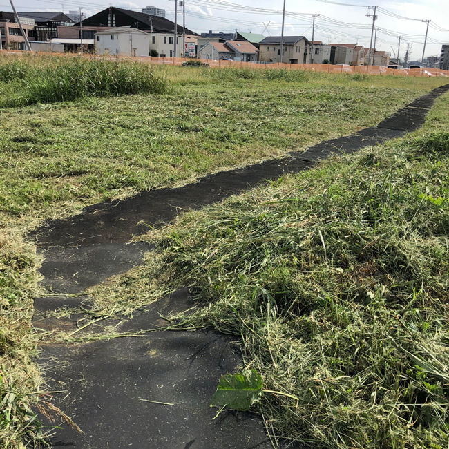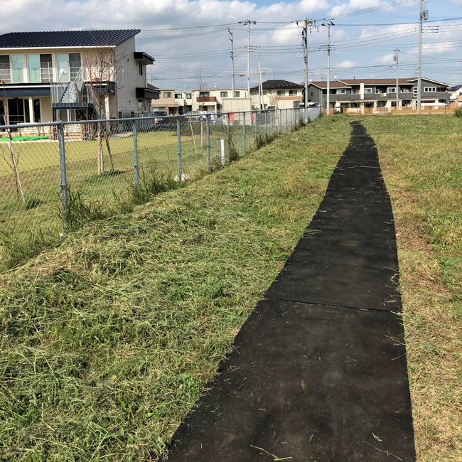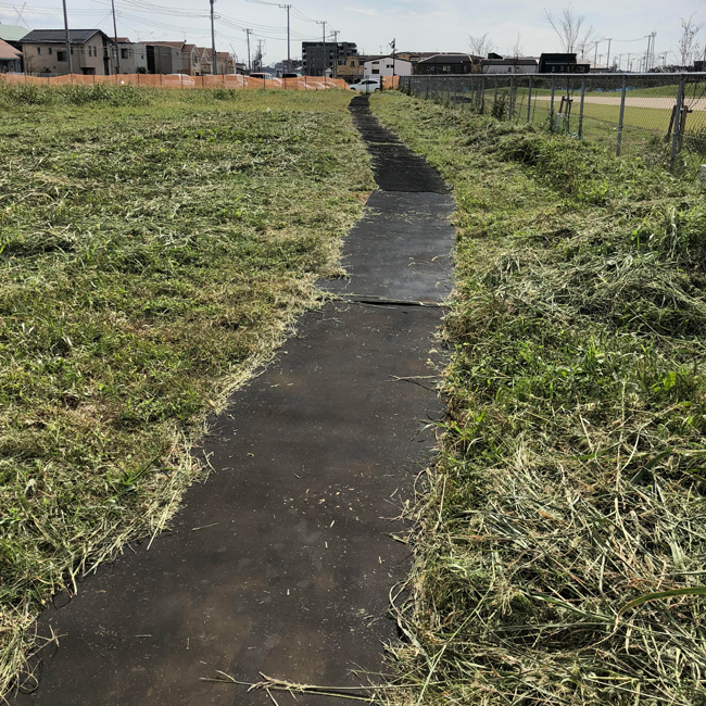 駐車場から幼稚園までの草地にゴムシートで仮設歩道を設置
