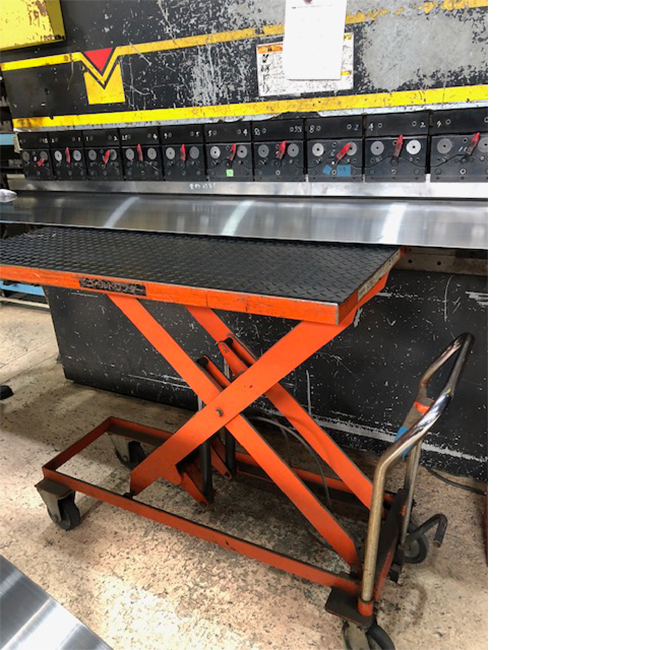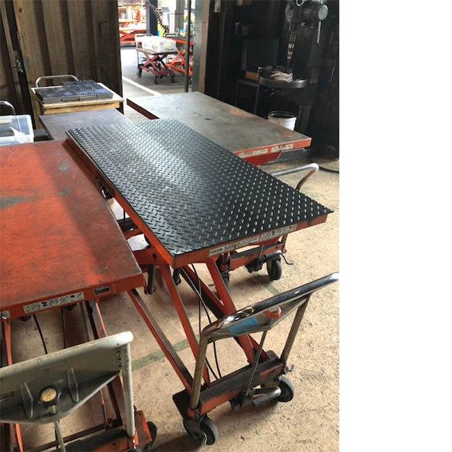 ハンドリフターの天板に加工中製品のキズ防止と滑り止めにゴムマットを敷いておられます。