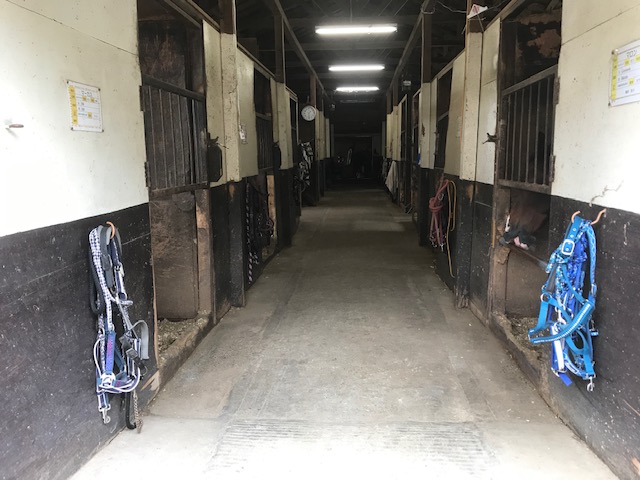 ■厩舎内 ゴムマットの上を馬を連れてあるく様子