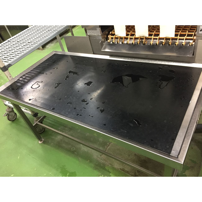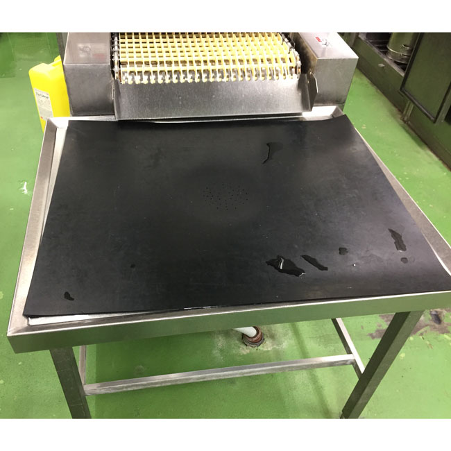 三重の製造業様からのご注文で食缶洗浄機の出口側で、クリーンテーブルの上に出てくるトレーなどの衝撃を、やわらげるために使用されています