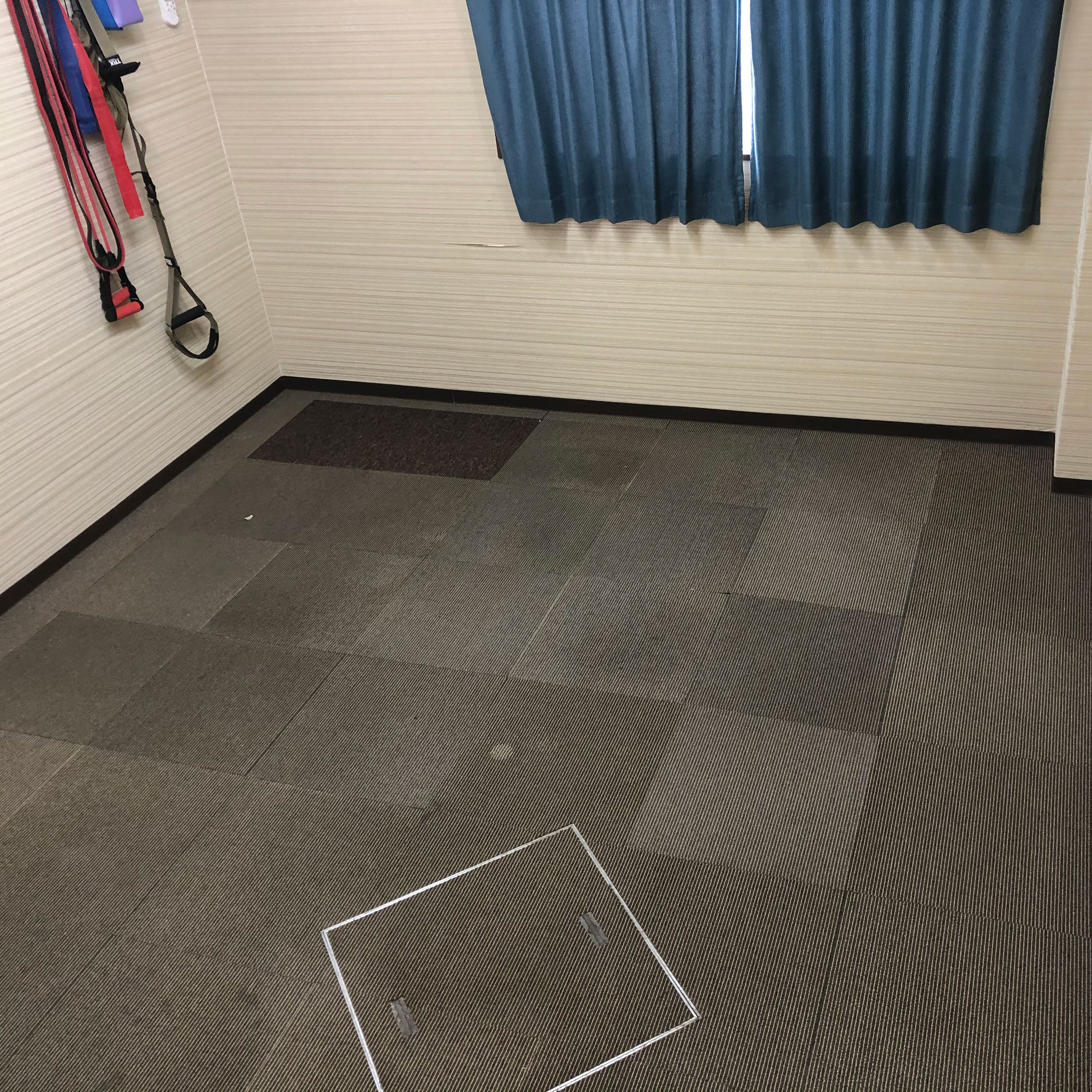 敷き詰め前はタイルカーペットですかね。敷き詰めていただいたスポーツジムマットは厚さ25mmなのでかなりしっかりとした雰囲気が伝わります。このようにピタッと敷き詰めていただくと、ゴムマットのずれはほとんどないかと思います。