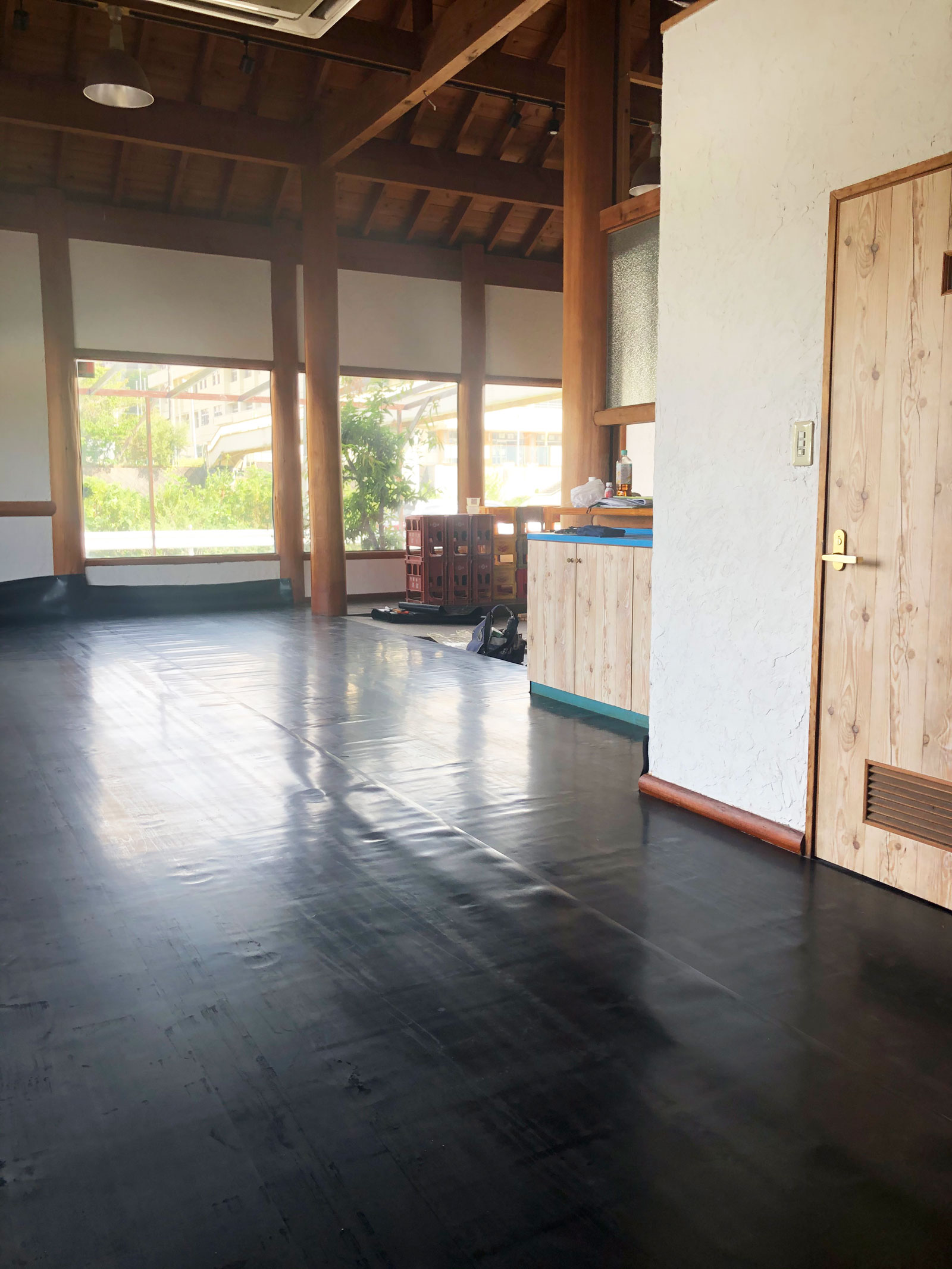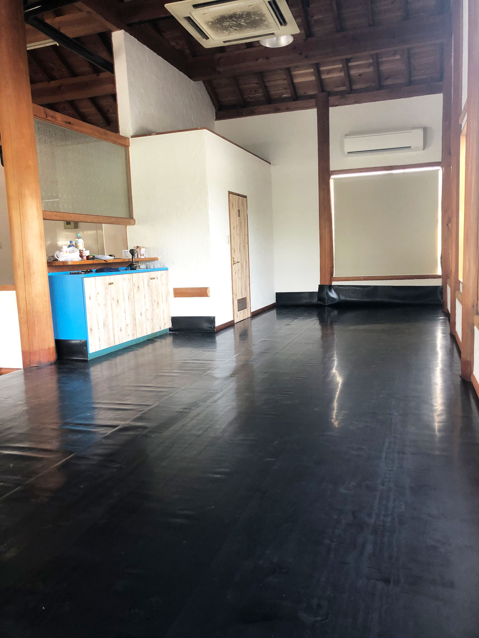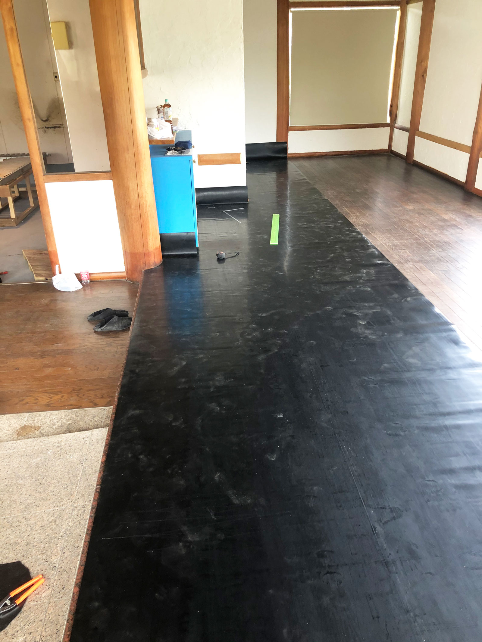 今回は室内の養生にゴムマットを敷いていただきました。2M幅を2本並べるほどの広いスペースでしたが、さすが工務店さんですね、隙間なくビシッと敷き詰められてます。敷いてしまえばカンタンなように見えますけど、そもそもゴムマットは重いですから目的の場所まで運ぶことも大変ですし、カットも作業台の上ではできずに地べたに張り付くようにして作業しなければいけないので、想像されるより困難です。ちなみに3mm×2M×10Mは90kgくらいあります。